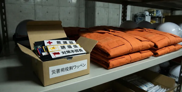 地震や火災などの災害が起きた時、現場は混乱します。「誰が指揮官か」「誰が救護係か」が一目で分かることは、素早い避難や救助のためにとても大切です。 普段は外している、あるいは内側にしまっている「救護班」「誘導係」「対策本部長」といった役割ワッペンを、災害時に防災服やヘルメットのペタッと貼れる部分に装着する。これだけで誰の指示に従えばいいかがはっきりし、スムーズな避難誘導ができるようになります。