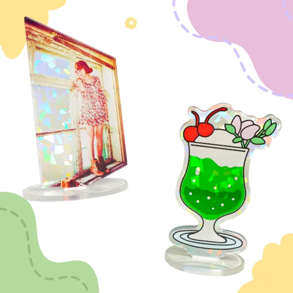 デザインの周囲に広がる透明なアクリル部分が、光を反射して華やかな虹色の色彩を映し出す点にあります。特殊なレインボー加工が施されたアクリル板を使用することで、室内の照明や太陽光など、当たる光の角度や強さによって見え方が劇的に変化します。 例えば、窓際に飾っておけば、時間帯によって移り変わる自然光を受けて爽やかなプリズムを放ち、イベント会場やライブハウスなどのスポットライトの下では、より一層ダイナミックで眩い輝きを放ちます。 ただ平面に印刷されただけの従来のアクリルスタンドとは異なり、「光」「色彩」「デザイン」の3つの要素が複雑に絡み合うことで、平面のイラストに奥行きと躍動感が生まれます。キャラクターが魔法を使っているかのようなエフェクトを表現したり、アイドルがステージ上で輝く姿を再現したりと、デザインとの相乗効果によってワンランク上のプレミアムな完成度を実現するアイテムです。