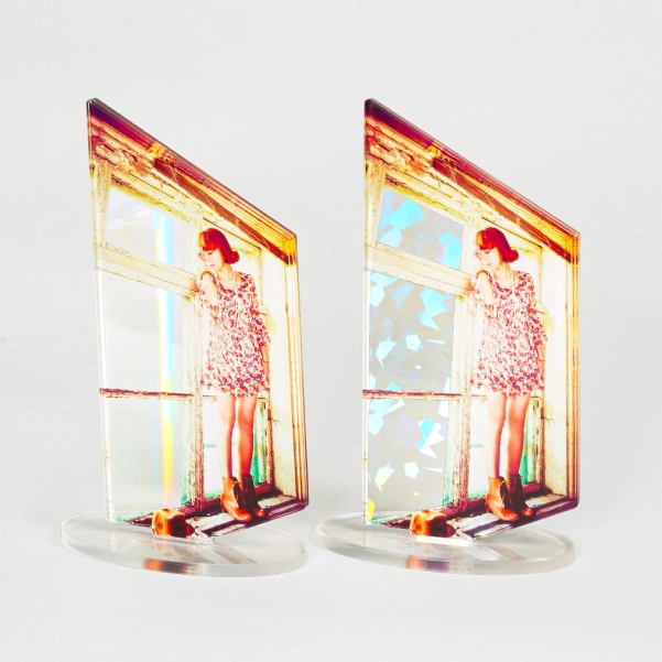 本製品はお客様のお好みやデザインのテイストに合わせて、「ノーマルタイプ」と「クリスタルタイプ」の2種類のレインボー加工からお選びいただける仕様となっております。 「ノーマルタイプ」は、アクリルの表面全体に均一で滑らかな虹色の反射をもたらす、王道かつスタイリッシュな仕上がりが特徴です。キャラクターのイラストや企業のロゴなど、メインとなるデザインをしっかりと際立たせつつ、背景にさりげなくも美しい虹色のオーラを纏わせたい場合に最適です。 一方「クリスタルタイプ」は、アクリル表面に細かなホログラムのようなテクスチャ加工が施されており、光が当たることで宝石のようにキラキラと乱反射する、よりゴージャスで華やかな仕上がりが特徴です。アイドルグッズや魔法少女系のキャラクター、あるいは周年記念などの特別なお祝いの品として、インパクトと豪華さを最大限に引き出したい場合に絶大な効果を発揮します。この2つを使い分けることで、より理想に近いグッズ製作が可能です。