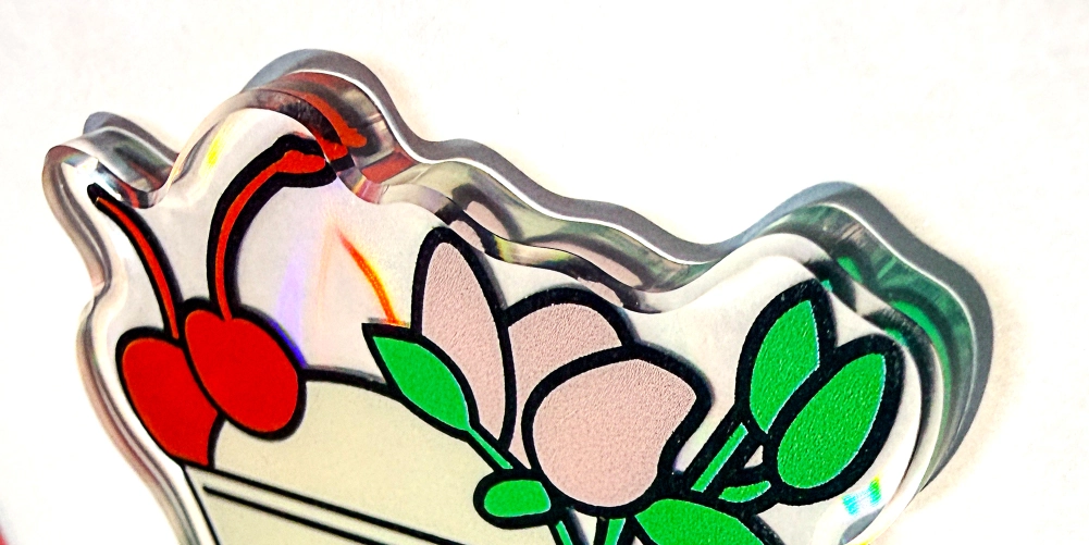 どれほど見た目が美しくても、グッズとしての耐久性が低ければ、お客様に長く愛用していただくことはできません。お気に入りのアクスタをカバンに入れて持ち歩いたり、色々な場所に連れ出して写真を撮ったりする「アクスタとお出かけ」は、今やファンにとってスタンダードな楽しみ方です。しかし従来のアクスタは、持ち歩くうちに印刷面が擦れて剥がれたり、傷がついてしまったりする弱点がありました。 弊社の「レインボーアクリルフィギュアスタンド」は、この問題を完全に解決する独自の「保護フィルム構造」を採用しています。デザインを印刷した面の上から、さらに透明度の高いPETフィルムで全面をしっかりとカバーし、コーティングしているのです。 このフィルム保護により、印刷インクが直接外部に露出することがありません。ポーチの中で鍵やコインと擦れても、誤って爪で強く引っ掻いてしまっても、大切なデザインが剥がれることは絶対にありません。美しい輝きを新品のまま長く楽しんでいただける、安心の品質です。
