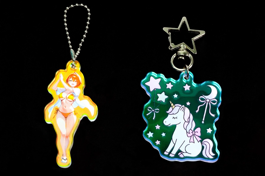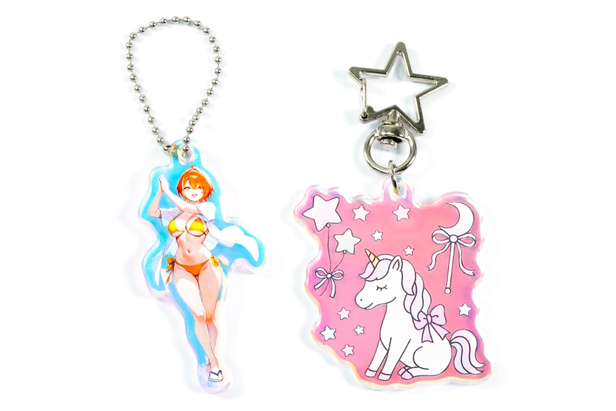 オーロラアクリルキーホルダーは、その輝き自体が“特別感”を演出します。条件によって色が変化するため、まるで動いているかのような動きを感じさせ、他のアクリルグッズにはない高級感と存在感を放ちます。記念イベントや周年グッズ、数量限定のアイテムとしても人気が高く、贈る人にも手にする人にも印象に残る仕上がりです。デザインの美しさを引き立てながら、“限定品らしさ”をしっかり伝えられる、それが当店のオーロラアクリルキーホルダーです。