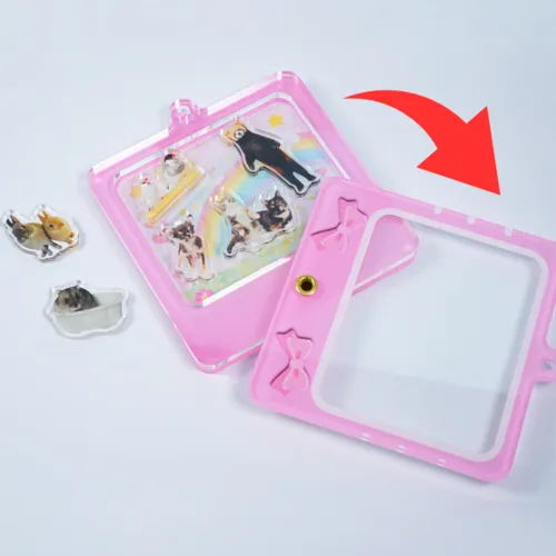 当店のシャカアクリルキーホルダーは、フレームが開閉可能な設計になっています。他社のシャカシャカアクリルキーホルダーのなかには、フレームが完全に密閉されていて中のアクリルパーツを変更できないケースもありますが、当社の製品なら、好きなときにフレームを開いてパーツの入れ替えや配置の変更が可能です。「今日はこのキャラとこのキャラを入れよう!」といった、ユーザー側の遊び心をくすぐるギミックです。