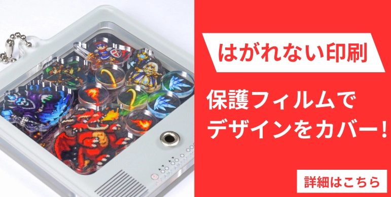 当店のアクリル製品の強みのひとつが、印刷がはがれるのを防ぐ保護フィルムです。印刷面を保護フィルムがカバーしているため、固いものがこすれたりしても印刷がはがれることがありません。シャカシャカアクリルキーホルダーも例外ではなく、フレーム自体はもちろん、中のパーツ1個1個に保護フィルムが付いています。