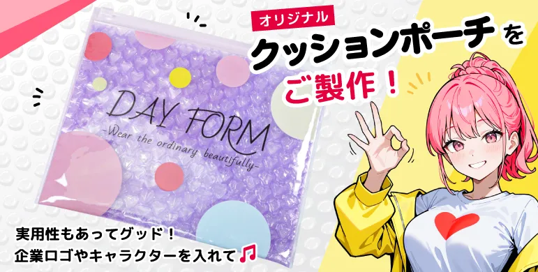 ポーチ内に入れた持ち物をプチプチとしたデザインのクッションでしっかり保護しながら収納できる高い実用性に加え、自社のロゴやキャラクターを印刷でき、ブランドイメージをそのまま形にできます。イベント配布のノベルティや販売用グッズとして、実用性とオリジナリティを兼ね備えたブランディングツールとして、大活躍間違いなし!