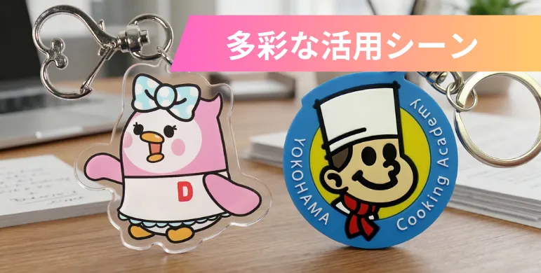 オリジナルキーホルダーは、実用性とデザイン性を兼ね備えたアイテムとして、ビジネスの現場から個人のプライベートな記念品まで、極めて幅広いシーンで活用されています。ここでは、ホットモバイリーで製作されるお客様が、実際にどのような目的でキーホルダーを活用されているのか、代表的なシーンをご紹介します。