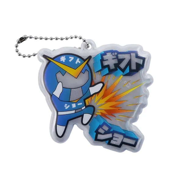 ・リフレクターキーホルダー(反射素材):自動車のライト等で反射する素材(リフレクター素材)を使用したキーホルダーです。交通安全グッズとして自治体様、自動車メーカー様を中心に、多数ご利用頂いております。当店では小ロット100個~製作可能です。