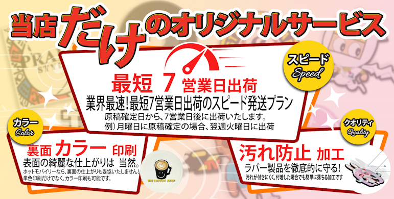 | 汚れ防止加工 | オリジナルコースターに付着した日常的な汚れが簡単にとれる加工です。【@77円(税込)】気になる黒ずみなどの汚れが付きにくく、また付着した場合でも落ちやすくなります。※納期は、+3~5営業日かかります。 |
