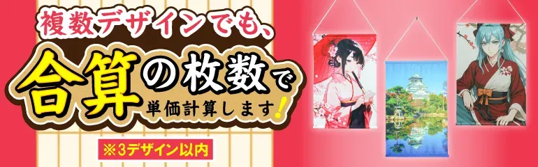 一般にタペストリーは複数のデザインで製作しようとすると、料金が高くなりがちです。たとえば、2デザインで50枚ずつ製作する場合、単価はそれぞれ50個注文の場合の単価が適用され、1デザインで100個製作する場合よりも総額が高くなります。